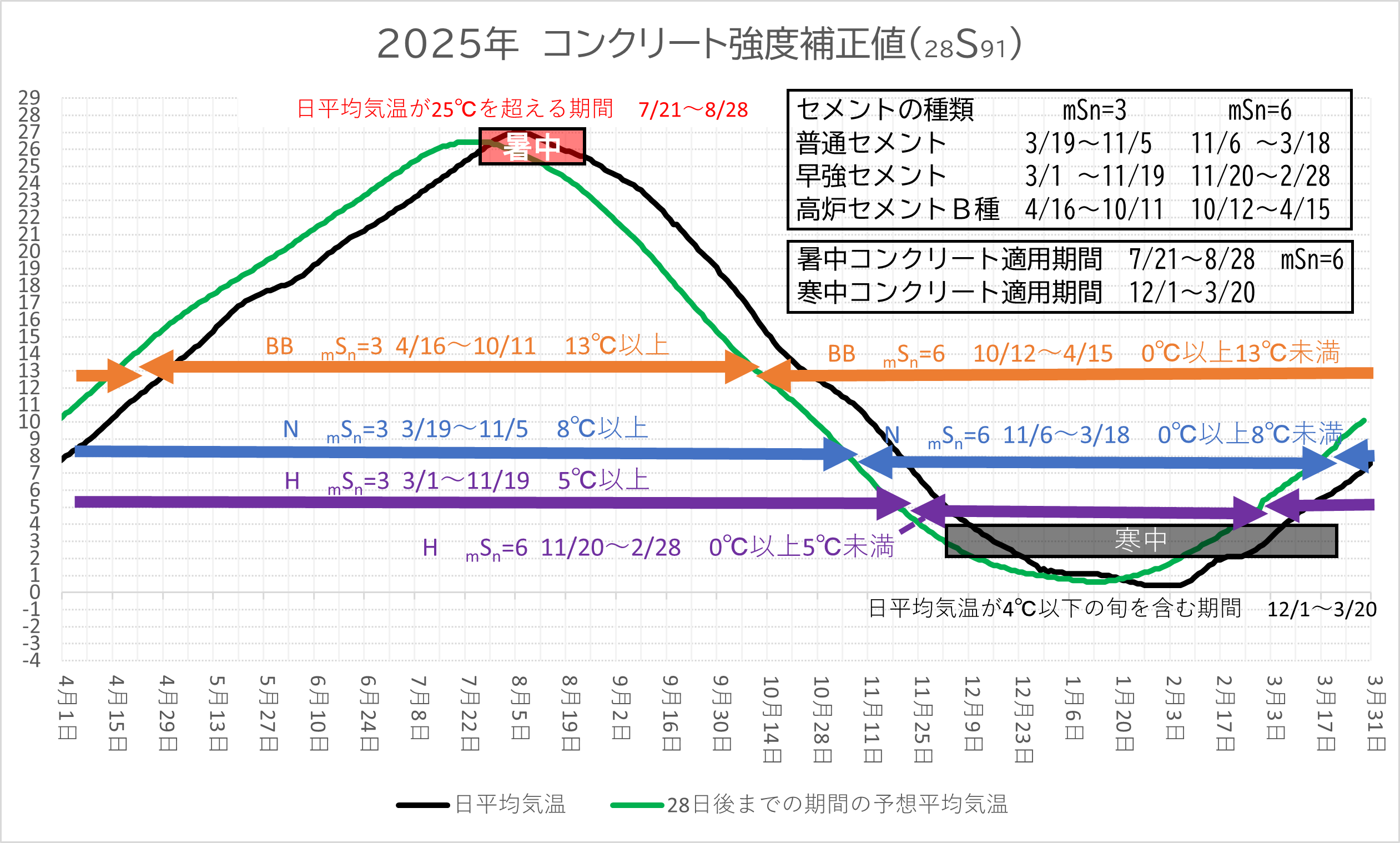 左のグラフは秋田気象台における2015年〜2024年の日平均気温の平滑値(黒い曲線)から計算した28日後まで期間の平均気温(緑色の曲線)を表したものです。 セメントの種類によってコンクリート強度補正値(mSn=3,mSn=6)の期間が異なります。 暑中コンクリート適用期間は過去10年間の平滑日平均気温が25℃を超える期間で7月21日〜8月28日、コンクリート強度補正値はmSn=6です。 寒中コンクリート適用期間は10年ごとに更新される過去30年間の日平均気温平滑値が4℃を含む旬となり、期間は12月1日〜3月20日になります。 | |||